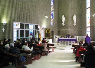 Testimonio del P. Párroco de La Asunción de Parla.-  El día 23 de febrero la Imagen de la Virgen llegó a la ciudad de Parla. A las 9 de la noche la hemos recibido en la Parroquia de Nuestra Señora de la Asunción, la más antigua de Parla. Después de una entrada solemne al templo hemos participado juntos entre la comunidad polaca y la parroquial en un acto mariano, con oraciones, Exposición del Santísimo. A las 10 de la noche se ha celebrado un acto mariano con la comunidad polaca, hasta las 11 y media. Nos hemos organizado de esta forma para tener esta noche Adoraciòn Nocturna ya que hay un grupo de la Adoración Nocturna Femenina Española (ANFE). A las 11 y media de la noche se celebró la Santa Misa y luego hasta las 6 de la mañana turnos de adoración nocturna. Después de la reserva, se celebró la Misa en polaco a las 7 de la mañana. A las 8 de la mañana todos juntos rezamos el rosario de la aurora por las calles de parla y a las 9 de la mañana nos hemos despedido a la Virgen, que fue llevada a Móstoles en la misma diócesis de Getafe. Todo, desde el principio hasta el final, fue muy impresionante y con mucha emoción, sin mencionar las lágrimas derramadas. Al salir ya por la mañana, el vehículo incluso tuvo pequeñas dificultades, lo cual hemos interpretado en el sentido de que la Virgen no quería abandonarnos. Gracias a Dios hemos tenido una oportunidad única e irrepetible por la cual estamos muy agradecidos. Os mandamos alguna foto recordatoria. Un saludo. P. Andrés. Móstoles Misa Polacos