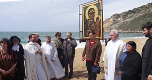 Następnie Ikona stanęła na murach starych fortyfikacji, gdzie miejscowi razem z członkami Koalicji Od Oceanu do Oceanu wspólnie odmówili Różaniec, po czym wszyscy udali się do miejscowego barokowego kościoła Naszej Pani z Nazaré, gdzie znajduje się stara figurka Matki Bożej z Nazaretu, którą raz do roku, podczas odpustu 8 września wierni zanoszą nad brzeg oceanu. Uroczystej Mszy św. przewodniczył ks. Moises Erśes w asyście ks. prał. Andrzeja Steckiewicza z Białorusi oraz o. Włodzimierza Ogorzałka OSPPE z Polski, reprezentującego Klasztor Jasnogórski. Do kościoła przybył także przedstawiciel wspólnoty Rosyjskiej Cerkwi Prawosławnej ks. Iorn Gherbovetcki z Fare, który także uczestniczył w przejściu nad brzeg oceanu. Prawosławne święta rzadko wypadają w tym samym czasie, jak katolickie. W tym roku jednak Święto Zwiastowania celebrowano prawie jednocześnie: w Kościele prawosławnym w niedzielę 7 kwietnia, a w Kościele katolickim w poniedziałek 8 kwietnia. Tak wic znowu Matka Boża nas połączyła.