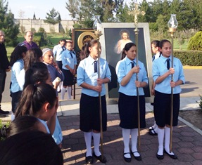 Przy śpiewie pieśni do Bożego Miłosierdzia procesyjnie wniesiono Ikonę do głównej sali gimnastycznej i ustawiono centralnie z przodu. Przed oczami Madonny rzędami siedziało trzy tysiące uczennic. Ta olbrzymia sala ma drewnianą podłogę i jest jedynym zadaszonym pomieszczeniem, gdzie mogą się zmieścić wszyscy mieszkańcy Miasta Dziewcząt: uczennice, siostry, które się nimi opiekują oraz pracownicy ochrony, koniecznej w Meksyku dla zapewnienia bezpieczeństwa.